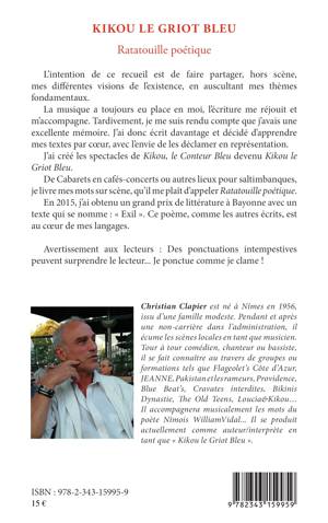 « L’intention de ce recueil est de faire partager, hors scène, mes différentes visions de l’existence, en auscultant mes thèmes fondamentaux. La musique a toujours eu place en moi, l’écriture me réjouit et m’accompagne. Tardivement, je me suis rendu compte que j’avais une excellente mémoire. J’ai donc écrit davantage et décidé d’apprendre mes textes par coeur, avec l’envie de les déclamer en représentation. De Cabarets en cafés-concerts ou autres lieux pour saltimbanques, je livre mes mots sur scène, qu’il me plaît d’appeler "Ratatouille poétique". »