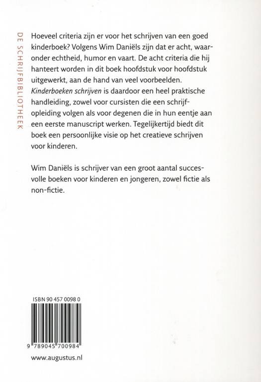 Hoeveel criteria zijn er voor het schrijven van een goed kinderboek? Volgens Wim Daniëls zijn dat er acht, waaronder echtheid, humor en vaart. De acht criteria die hij hanteert worden in dit boek hoofdstuk voor hoofdstuk uitgewerkt, aan de hand van veel voorbeelden. Kinderboeken schrijven is daardoor een heel praktische handleiding, zowel voor cursisten die een schrijfopleiding volgen als voor degenen die in hun eentje aan een eerste manuscript werken. Tegelijkertijd biedt dit boek een persoonlijke visie op het creatieve schrijven voor kinderen. Wim Daniëls is schrijver van een groot aantal succesvolle boeken voor kinderen en jongeren, zowel fictie als non-fictie.