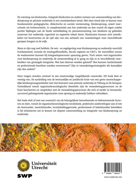 Deze vragen stonden centraal in een meervoudige vergelijkende casestudie. Dit boek doet er verslag van. De aanleiding was de bestuurlijke en juridische fusie van een grote maatschappelijke kinderopvangaanbieder met vier besturen voor primair onderwijs in Tilburg en De Kempen. Vertrekkend vanuit organisatiesociologische theorieën zijn de veranderingsprocessen na de fusie beschreven en vergeleken met de veranderingsprocessen die zich al eerder in bestaande, succesvol geïntegreerde organisaties voor opvang en onderwijs hebben voltrokken. Het boek sluit af met een overzicht van de belangrijkste bevorderende en belemmerende factoren en doet, vanuit de organisatiesociologische invalshoek, praktische aanbevelingen aan al wie als bestuurder, toezichthouder, locatieleidinggevende, professional of beleidsmaker betrokken is bij initiatieven om te komen tot diepere samenwerking en integratie van kinderopvang en onderwijs.