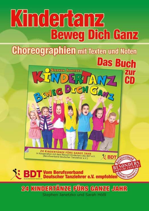 Kindertanz - Beweg Dich Ganz. 24 Kindertänze fürs ganze Jahr. Das Buch zur CD mit Choreographien, Texten, Gitarrengriffen und Noten. In diesem Buch sind alle Jahreszeiten, Feste und Themen vertreten. Also eine perfekte Lieder- und Tänze-Sammlung für das ganze Jahr. In Kooperation mit Stephen Janetzko und dem BDT e.V. (Berufsverband Deutscher Tanzlehrer). Jedem Monat von Januar bis Dezember sind jeweils zwei Lieder zugeordnet. Alle im Buch enthaltenen Lieder: 1. Zähl mit uns die Jahreskinder 2. Tip tap tiddel ... ich laufe durch den Schnee 3. Wenn alle Indianer jetzt reiten 4. Ägypter-Tanz 5. Der Oster-Rock'n'Roll 6. Riesen und Zwerge 7. Max der kleine Zauberhund 8. Hix-hex, Hexe 9. Ki-Ka-Kuchentanz 10. Bruderherz - komm, tanz mit mir! 11. Ich treibe Sport 12. In meiner Bi-Ba-Badewanne 13. Arriba! (Sommertanz) 14. Disco-Peppo 15. Ich liege auf der Wiese 16. Kleine Mücken tanzen 17. Vogelscheuchen-Schrotti 18. An meiner Schule ist es schön 19. Hand in Hand 20. Hi-Ha-Halloween 21. Laterne, Laterne, komm leuchte für mich 22. Der Kleine-Engel-Tanz 23. Wer hat dem Weihnachtsmann den Mantel geklaut? 24. Schnee, Schnee, Schnee. Diese komplett farbige und übersichtlich gestaltete Buchausgabe enthält neben den Liedern (Texte, Noten, Gitarrengriffe) komplett ALLE Tanzchoreographien mit Hinweisen für den Kindertanz-Einsatz. --- Aus dem Vorwort: "Kindertanz - beweg dich ganz" - Ein Titel wird Programm. Kindertanz greift die Bewegungsfreude der Kinder auf und fördert auf spielerische Weise die kreativen, musikalischen und sozialen Kompetenzen. Beim Tanzen lernen die Kinder verschiedene Rhythmen kennen und können immer wieder neue Gestaltungsideen ausprobieren. Darüber hinaus erleben die Kinder durch die Gruppe und das spielerische Heranführen an feste Bewegungsabläufe Gemeinschaft und Zusammenhalt und machen die Erfahrung, dass gemeinsames Üben zu einem schönen Erfolgserlebnis führen kann - wie zum Beispiel eine Tanzvorführung beim anstehenden Sommerfest. Obwohl die vielfältigen positiven Auswirkungen von Musik und Tanz auf die Entwicklung von Kindern unbestritten sind, fehlen immer wieder Angebote, die gut umsetzbar sind und leicht in den Alltag von Kindergarten und Krippe integriert werden können. Mit "Kindertanz - beweg dich ganz!" bietet der BDT eine gelungene Sammlung an Liedern und Tänzen rund um die Jahreszeiten, die nicht nur in Tanzschulen, sondern vielfältig in pädagogischen Einrichtungen eingesetzt werden kann. Neben der Musik des bekannten Kinderliedermachers Stephen Janetzko, sind es vor allem die phantasievoll arrangierten Choreographien von Sarah Hößl, die das Werk bereichern und für die pädagogische Praxis so nutzbar machen. Das Know-How von Sarah Hößl, die mit Kindertanz groß geworden ist und im BDT Kindertanzfachlehrer ausbildet, zeigt sich in den detaillierten Tanzbeschreibungen und den altersgemäßen Schritten und Figuren, die in den Tänzen vorkommen. So bietet das Werk ein gut umsetzbares kindgerechtes Repertoire an Tänzen für ein ganzes Jahr. Viel Freude beim Tanzen mit Disco Peppo, Vogelscheuche Schrotti und Co! (Dr. phil. Anne Frey, Diplompsychologin und Tanzpädagogin, Fakultät für Psychologie und Pädagogik, Lehrstuhl für Grundschulpädagogik und -didaktik)