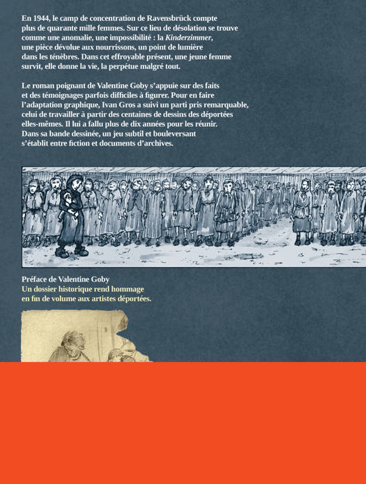 En 1944, le camp de concentration de Ravensbrück compte plus de quarante mille femmes. Sur ce lieu de désolation se trouve comme une anomalie, une impossibilité : la Kinderzimmer, une pièce dévolue aux nourrissons, un point de lumière dans les ténèbres. Dans cet effroyable présent, une jeune femme survit, elle donne la vie, la perpétue malgré tout. Le roman poignant de Valentine Goby s'appuie sur des faits et es témoignages parfois difficiles à figurer. Pour en faire l'adaptation graphique, Ivan Gros a suivi un parti pris remarquable, celui de travailler à partir des centaines de dessins des déportées elles-mêmes. Il lui a fallu plus de dix années pour les réunir. Dans sa bande dessinée, un jeu subtil et bouleversant s'établit entre fiction et documents d'archives.