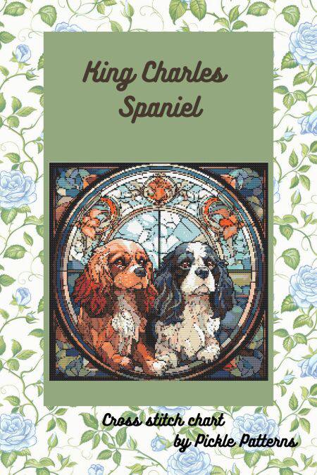 These cross stitch charts are a whimsical design of two King Charles Spaniels reminiscent of stained glass.