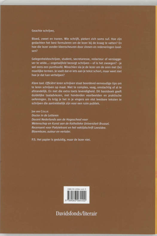 Bloed, zweet en tranen. Wie schrijft, piekert zich soms suf. Hoe zijn gedachten het best formuleren om de lezer bij de kraag te vatten. En hoe die lezer zonder kleerscheuren door zinnen en redeneringen loodsen? Gelegenheidsschrijver, student, secretaresse, redacteur of verslaggever te velde...: ongetwijfeld bezorgt schrijven - of is het zwoegen? - u wel eens een punthoofd. Misschien slaat u uw lezer om de oren met (te) moeilijke termen. U voelt dat er iets aan uw tekst schort, maar weet niet hoe u dat kan verhelpen? Klare taal. Efficiënt leren schrijven staat boordevol eenvoudige tips om te leren schrijven op maat. Niet te complex, vaag, omslachtig of al te afstandelijk. En met die extra toets levendigheid. Dit basisboek geeft duidelijke taaladviezen, met honderden voorbeelden en praktische oefeningen. Zo krijgt u het in uw vingers om vlot leesbare teksten te schrijven die aantrekkelijk zijn voor een ruim publiek.
