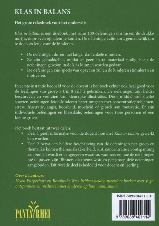 Het uitgangspunt van dit boek is om leerkrachten te inspireren om vanuit een speelse benadering samen met de kinderen tussen de drukke uurtjes door even op adem te komen. Door middel van allerlei soorten oefeningen, zoals ademhalingsoefeningen en stretchoefeningen, leren kinderen beter omgaan met concentratieproblemen, stress, frustratie, angst, boosheid, moeheid, gebrek aan creativiteit en eenzaamheid. De docent kan de progressie van de kinderen goed in de gaten houden door hun gedrag en gevoelens met hen te evalueren aan de hand van speciale feedbackformulieren. De oefeningen zijn gemakkelijk te doen zonder voorbereiding en kunnen in de klas op de plaats gedaan worden. Ze zijn in eerste instantie bedoeld om klassikaal te doen, maar kunnen ook individueel worden aangeboden. Geschikt voor kinderen van groep 3 t/m 8 van de basisschool. Met het activiteitenboek Klas in balans keert orde en rust als vanzelf weer terug in de klas.