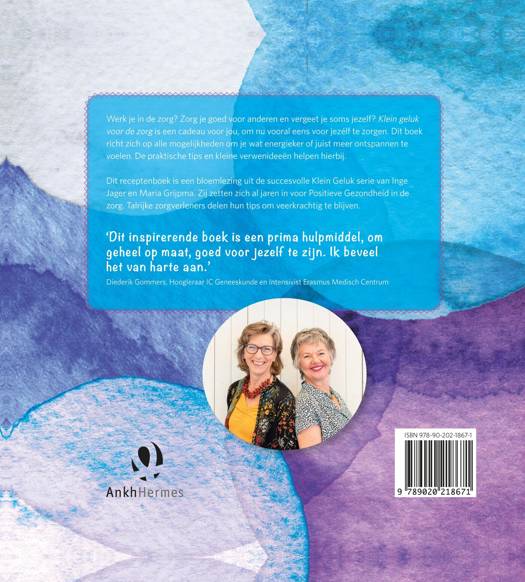 'Klein geluk voor de zorg' van Inge Jager en Maria Grijpma is een hart onder de riem voor wie in de zorg werkt. Wie voor anderen zorgt, moet ook goed voor zichzelf zorgen. Maar in tijden van grote drukte en stress en zeker nu is dat makkelijker gezegd dan gedaan. Voor al die handen aan het bed, alle mensen die direct met patiënten werken, maakten Inge Jager en Maria Grijpma Klein geluk voor de zorg. Een hart onder de riem met tientallen tips om te ontspannen, goede boeken om te lezen en fijne dingen om te doen voor jezelf. Zodat je het vol blijft houden en kunt blijven doen waar je hart ligt. Met een voorwoord van Diederik Gommers!