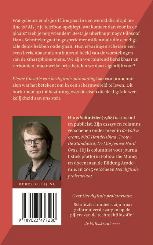 Is een virtuele ervaring hetzelfde als een fysieke ervaring? Bestaan Facebookvrienden? Is vervelen vervelend? Bestaat er een verschil tussen je online en je offline identiteit? Wanneer ben je een junkie? Steeds meer mensen worstelen met hun omgang met de schermwereld. Scholen en bedrijven experimenteren met schermvrije dagen, er ontstaan resorts en trainingen voor digitale ontgifting en er leeft een grote behoefte om te ‘ontkoppelen’. Filosoof Hans Schnitzler gaat in gesprek met millennials die een digitale detox hebben ondergaan. Kon je je weg nog vinden? Als je je telefoon opzijlegt, wat komt er dan in de plaats? Heb je nog vrienden? Besta je nog? En, misschien wel het interessantste filosofische vraagstuk: pak je je digitale bestaan nadien gewoon weer op? Kleine filosofie van de digitale onthouding laat zien wat er gebeurt als je plotseling offline gaat in een wereld die altijd online is. Aan de hand van interviews schetst Schnitzler een herkenbaar beeld van de problemen van de moderne mens.