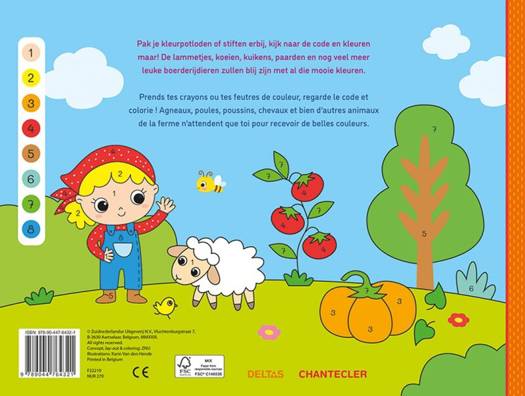Pak je kleurpotloden of stiften erbij, kijk naar de code en kleuren maar ! De lammetjes, koeien, kuikens, paarden en nog veel meer leuke boerderijdieren zullen blij zijn met al die mooie kleuren.