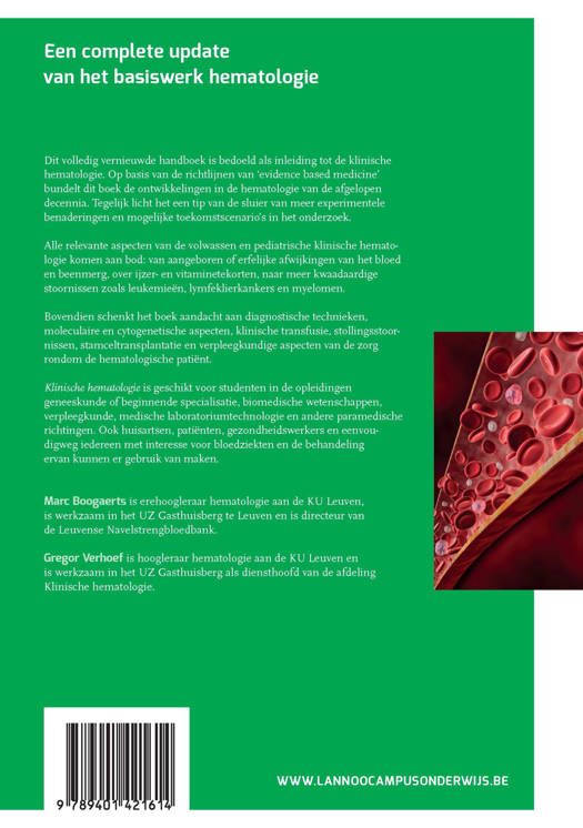 Het basiswerk hematologie, complete update Dit volledig vernieuwde handboek is bedoeld als inleiding tot de klinische hematologie. Op basis van de richtlijnen van 'evidence based medicine' bundelt dit boek de ontwikkelingen in de hematologie van de afgelopen decennia. Tegelijk licht het een tip van de sluier van meer experimentele benaderingen en mogelijke toekomstscenario's in het onderzoek. Alle relevante aspecten van de volwassen en pediatrische klinische hematologie komen aan bod: van aangeboren of erfelijke afwijkingen van het bloed en beenmerg, over ijzer- en vitaminetekorten, naar meer kwaadaardige stoornissen zoals leukemieën, lymfeklierkankers en myelomen. Bovendien schenkt het boek aandacht aan diagnostische technieken, moleculaire en cytogenetische aspecten, klinische transfusie, stollingsstoornissen, stamceltransplantatie en verpleegkundige aspecten van de zorg rondom de hematologische patiënt. Klinische hematologie is geschikt voor studenten in de opleidingen geneeskunde of beginnende specialisatie, biomedische wetenschappen, verpleegkunde, medische laboratoriumtechnologie en andere paramedische richtingen. Ook huisartsen, patiënten, gezondheidswerkers en eenvoudigweg iedereen met interesse voor bloedziekten en de behandeling ervan kunnen er gebruik van maken.