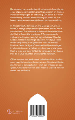 Nonnen waren vindingrijk, rebels en hun levens bevatten verrassende lessen voor ons vandaag. In Kloosterwijsheden helpen Ana Garriga en Carmen Urbita je met je hedendaagse problemen aan de hand van de meest fascinerende nonnen uit de renaissancetijd. Heb je financiële problemen? Theresia van Ávila en haar medezusters van het karmelietessenklooster hebben recessiebestendige adviezen. Houd je je social media angstvallig in de gaten om niets te missen? María de Jesús de Ágreda’s wonderbaarlijke ervaringen in bilocatie kunnen je helpen om daarmee om te gaan. Raak je in de war door liefde? De verlangens van Juana Inés de la Cruz bevatten onverwachte inzichten.