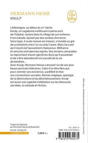Avec Knulp, Hermann Hesse a brossé l'un de ses plus beaux portraits littéraires. Celui d'un être libre qui, pour orienter son existence, a préféré le rêve aux conventions sociales. Personnage complexe et attachant, Knulp compose une figure fascinante de dilettante doué dont le lecteur pénètre peu à peu les pensées les plus secrètes... Roman magique, apologie de la liberté, de la désinvolture et du désintéressement, Knulp est aussi une superbe méditation sur les blessures secrètes, la solitude et l'échec.