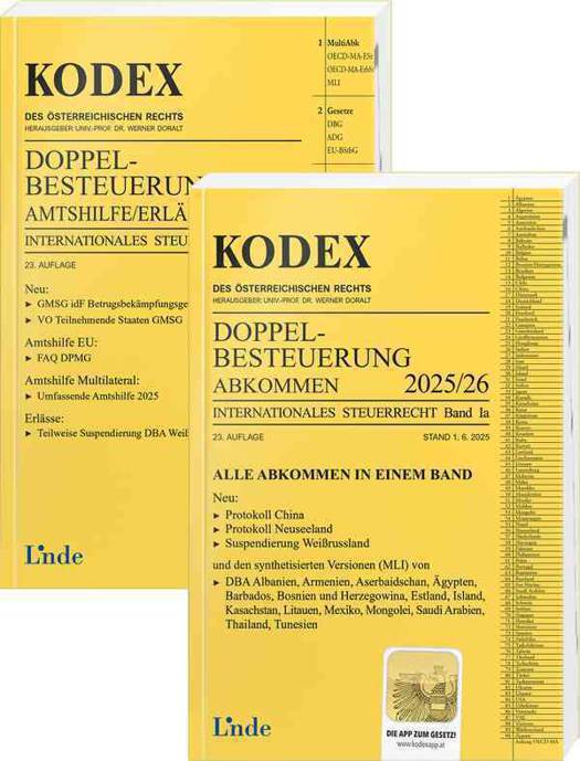 KODEX Doppelbesteuerungsabkommen 2025/26 23. Auflage, Stand 1.6.2025 Mit der App zum Gesetz Band Ia / Abkommen enthält sämtliche Doppelbesteuerungsabkommen von Ägypten bis Zypern sowie die OECD-Musterabkommen zur Einkommen- und zur Erbschaftsteuer.Band Ib / Amtshilfe/Erlässe beinhaltet neben den Gesetzen und Verordnungen zur Doppelbesteuerung und den Abkommen über den Informationsaustausch in Steuersachen ("TIEA") sowie Informationen zum Common Reporting Standard alle wesentlichen Gesetze, Übereinkommen und Verträge zur Amtshilfe. Im Anhang finden sich sämtliche DBA-Erlässe sowie Informationen des BMF.