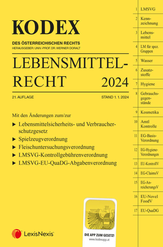 Der Kodex Lebensmittelrecht 21. Auflage mit Stand 1. 1. 2024 enthält: