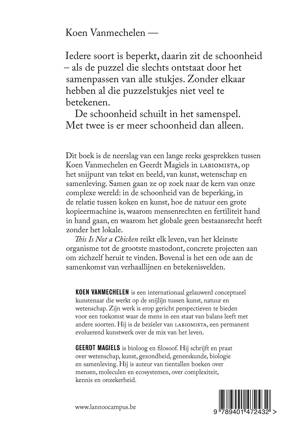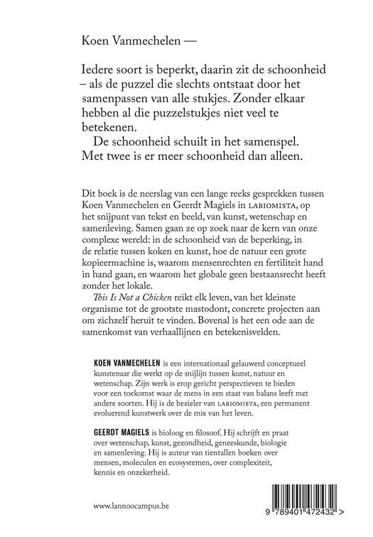 Dit boek is de neerslag van een lange reeks gesprekken tussen Koen Vanmechelen en Geerdt Magiels in LABIOMISTA, op het snijpunt van tekst en beeld, van kunst, wetenschap en samenleving. Samen gaan ze op zoek naar de kern van onze complexe wereld: in de schoonheid van de beperking, in de relatie tussen koken en kunst, hoe de natuur een grote kopieermachine is, waarom mensenrechten en fertiliteit hand in hand gaan, en waarom het globale geen bestaansrecht heeft zonder het lokale.