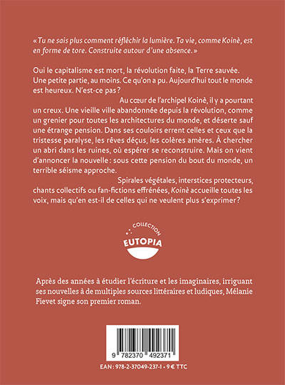 Au coeur de l'archipel Koinè, il y a pourtant un creux. Une vieille ville abandonnée depuis la révolution, comme un grenier pour toutes les architectures du monde, et déserte sauf une étrange pension. Dans ses couloirs errent celles et ceux que la tristesse paralyse, les rêves déçus, les colères amères. À chercher un abri dans les ruines, où espérer se reconstruire. Mais on vient d'annoncer la nouvelle : sous cette pension du bout du monde, un terrible séisme approche.