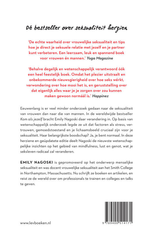 Eeuwenlang is er veel minder onderzoek gedaan naar de seksualiteit van vrouwen dan naar die van mannen. In de wereldwijde bestseller Kom als jezelf bracht Emily Nagoski daar verandering in. Op basis van wetenschappelijk onderzoek legde ze uit dat factoren als stress, vertrouwen, gemoedstoestand en je lichaamsbeeld cruciaal zijn voor je seksualiteit. Haar belangrijkste boodschap? Ja, je bent normaal. In deze herziene en geüpdatete editie deelt Nagoski de nieuwste wetenschappelijke inzichten op het gebied van mindfulness, lust en genot dat je seksleven radicaal zal veranderen.