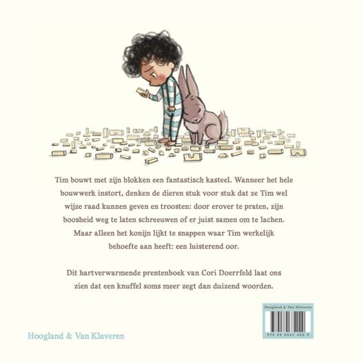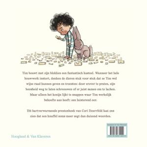 Tim bouwt met zijn blokken een fantastisch kasteel. Wanneer het hele bouwwerk instort, denken de dieren stuk voor stuk dat ze Tim wel wijze raad kunnen geven en troosten: door erover te praten, zijn boosheid weg te laten schreeuwen of er juist samen om te lachen. Maar alleen het konijn lijkt te snappen waar Tim werkelijk behoefte aan heeft: een luisterend oor. Dit hartverwarmende prentenboek van Cori Doerrfeld laat ons zien dat een knuffel soms meer zegt dan duizend woorden.