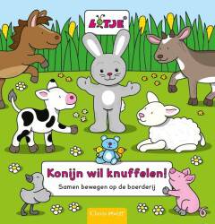 Konijn wil knuffelen! De jonge dieren op de boerderij hebben geen tijd om te knuffelen. Ze spelen voor de stal, achter het hek, op de boomstronk … samen met hun mama of papa. Wie wil er knuffelen met Konijn? Kun jij op elke pagina de blauwe beer en de twee kuikentjes vinden? Alle bewegingen die de dieren maken, kun je samen nadoen! Beweeg je mee met Konijn en haar mama?