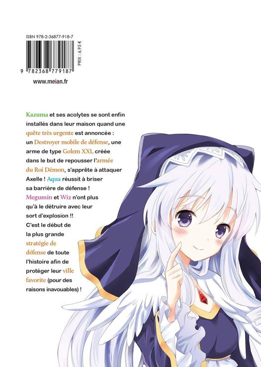 Kazuma et ses acolytes se sont enfin installés dans leur maison quand une quête très urgente est annoncée : un Destroyer mobile de défense, une arme de type Golem XXL créée dans le but de repousser l'armée de Mao, s'apprête à attaquer Axelle ! Aqua réussit à briser sa barrière de défense ! Megumin et Wiz n'ont plus qu'à le détruire avec leur sort d'explosion !! C'est le début de la plus grande stratégie de défense de toute l'histoire afin de protéger leur ville favorite (pour des raisons inavouables) !
