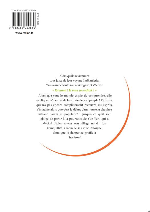 Alors qu'ils reviennent tout juste de leur voyage à Alkanletia, Yun-Yun déboule sans crier gare et s'écrie : " Kazuma ! Je veux un enfant ! " Alors que tout le monde essaie de comprendre, elle explique qu'il en va de la survie de son peuple ! Kazuma, qui n'a pas encore complètement recouvré ses esprits, s'imagine alors que c'est le début d'un nouveau chapitre mêlant harem et popularité... Jusqu'à ce qu'il soit obligé de partir à la poursuite de Yun-Yun, qui a décidé d'aller sauver son village natal ! La tranquillité à laquelle il aspire s'éloigne alors que le danger se profile à l'horizon !