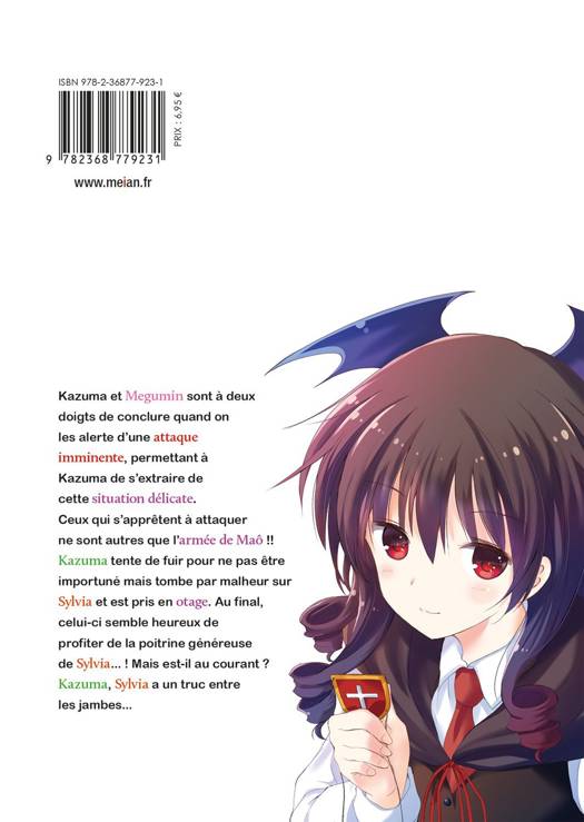 Kazuma et Megumin sont à deux doigts de conclure quand on les alerte d'une attaque imminente, permettant à Kazuma de s'extraire de cette situation délicate. Ceux qui s'apprêtent à attaquer ne sont autres que l'armée de Maô !! Kazuma tente de fuir pour ne pas être importuné mais tombe par malheur sur Sylvia et est pris en otage. Au final, celui-ci semble heureux de profiter de la poitrine généreuse de Sylvia... ! Mais est-il au courant ? Kazuma, Sylvia a un truc entre les jambes...
