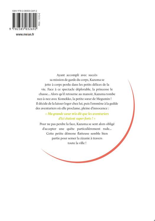 Ayant accompli avec succès sa mission de garde du corps, Kazuma se jette à corps perdu dans les petits délices de la vie. Face à ce spectacle déplorable, la princesse le chasse... Alors qu'il retourne au manoir, Kazuma tombe nez-à-nez avec Komekko, la petite soeur de Megumin ! Il décide de la laisser loger chez lui, puis l'emmène à la guilde des aventuriers où elle proclame, pleine d'innocence : " Ma grande soeur m'a dit que les aventuriers d'ici étaient super forts ! " Pour ne pas perdre la face, Kazuma se sent alors obligé d'accepter une quête particulièrement rude... Cette petite démone flatteuse semble bien partie pour semer la zizanie à travers toute la ville !