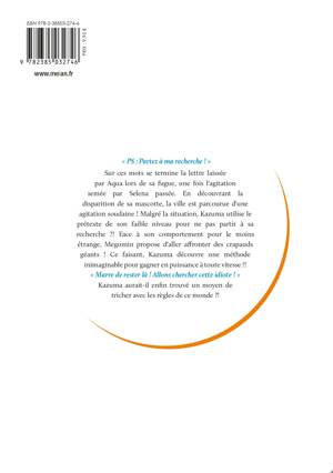 " PS : Partez à ma recherche ! " Sur ces mots se termine la lettre laissée par Aqua lors de sa fugue, une fois l'agitation semée par Selena passée. En découvrant la disparition de sa mascotte, la ville est parcourue d'une agitation soudaine ! Malgré la situation, Kazuma utilise le prétexte de son faible niveau pour ne pas partir à sa recherche ?! Face à son comportement pour le moins étrange, Megumin propose d'aller affronter des crapauds géants ! Ce faisant, Kazuma découvre une méthode inimaginable pour gagner en puissance à toute vitesse !! " Marre de rester là ! Allons chercher cette idiote ! " Kazuma aurait-il enfin trouvé un moyen de tricher avec les règles de ce monde ?!