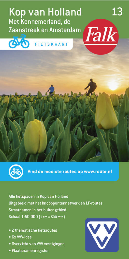 De Kop van Holland is het noordelijk deel van de provincie Noord-Holland. Deze regio is ingesloten door het IJsselmeer en de Noordzee. Kuststroken en het polders zijn dan ook typerende landschapskenmerken. Op deze fietskaart zijn ook de regio’s Zuid-Kennemerland en De Zaanstreek weergegeven.