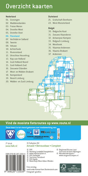 Flevoland is zeer bekend om haar natuurgebied de Oostvaardersplassen, grenzend aan het Markermeer. Dit natuurgebied met haar loslopende paarden en andere fauna is geprezen om haar diversiteit. Verken met de fietskaart ook dit natuurgebied en laat je inspireren! De fietskaart is voorzien knooppunten, het knooppuntennetwerk, LF-routes, plaats- en straatnamenregister, toeristische VVV-informatie, horecagelegenheden en een overzicht van alle VVV-kantoren in de regio. Alle straatnamen in het buitengebied zijn aangegeven.