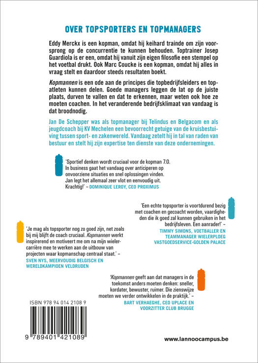Kopmannen is een ode aan de principes die topbedrijfsleiders en topatleten kunnen delen. Goede managers leggen de lat op de juiste plaats, durven te vallen en dat te erkennen, maar weten ook hoe ze moeten coachen. In het veranderende bedrijfsklimaat van vandaag is dat broodnodig.