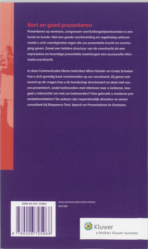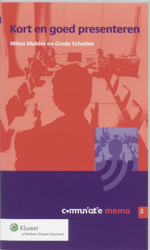 Kort en goed presenteren Presenteren op seminars, congressen voorlichtingsbijeenkomsten is een kunst en kunde. Met een goede voorbereiding en regelmatig oefenen maakt u zich vaardigheden eigen die uw presentatie kracht en overtuiging geven. Zowel een heldere structuur van de voordracht als een expressieve en levendige presentatie waarborgen een succesvolle informatie- overdracht. In deze Communicatie Memo belichten Milou Mulder en Grada Schadee hoe u zich grondig kunt voorbereiden op uw voordracht. Zij geven antwoord op de vragen hoe u de boodschap structureert en deze met succes presenteert, zodat toehoorders met interesse naar u luisteren. Hoe gaat u interactief om met uw toehoorders? Hoe gebruikt u moderne presentatiemiddelen? De auteurs zijn respectievelijk directeur en senior consultant bij Eloquence Text, Speech en Presentations te Oostzaan.