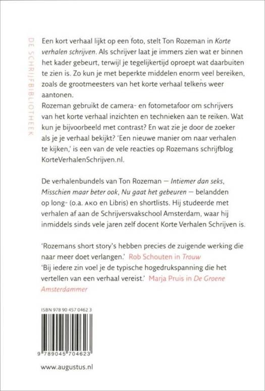 Een kort verhaal lijkt op een foto, beweert Ton Rozeman in Korte verhalen schrijven. Als schrijver laat je immers zien wat er binnen het kader gebeurt, terwijl je tegelijkertijd oproept wat daarbuiten te zien is. Zo kun je met beperkte middelen enorm veel bereiken, zoals de grootmeesters van het korte verhaal telkens weer aantonen. Rozeman gebruikt de camera- en fotometafoorom schrijvers van het korte verhaalinzichten en technieken aan te reiken. Wat kun je bijvoorbeeld met contrast? En wat zie je door de zoeker als je je verhaal bekijkt? Een nieuwe manier om naar verhalen te kijken, is een van de vele reacties op Rozemans schrijfblog Shortstory.nu.