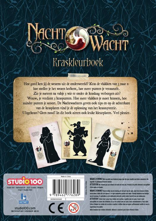Hoe goed ken jij de wezens uit de onderwereld? Kras de vlakken van 5 naar 1: hoe sneller je het wezen herkent, hoe meer punten je verzamelt. Zie je meteen na vakje 5 wie er onder de kraslaag verborgen zit? Wauw, je verdient 5 kraspunten. Hoe meer vlakken je moet krassen, hoe minder punten je scoort. De Nachtwachters geven ook tips en op de achterkant van de krasplaten vind je de oplossing van het krasmysterie. Uitgekrast? Geen nood! In dit boek zitten ook leuke kleurplaten. Veel plezier.