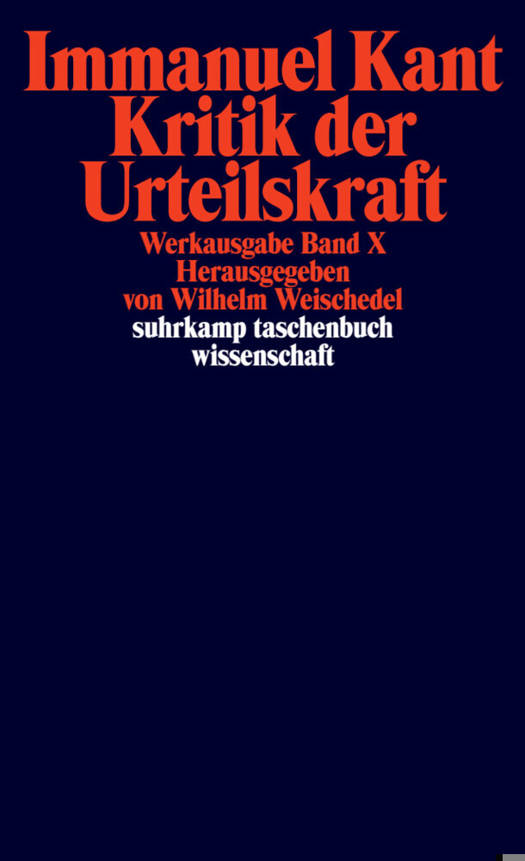 ERSTE FASSUNG DER EINLEITUNG IN DIE KRITIK DER URTEILSKRAFTEinleitung:I. Von der Philosophie als einem System / II. Von dem System der obern Erkenntnisvermögen, das der Philosophie zum Grunde liegt / III. Von dem System aller Vermögen des menschlichen Gemüts / IV. Von der Erfahrung als einem System für die Urteilskraft / V. Von der reflektierenden Urteilskraft / VI. Von der Zweckmäßigkeit der Naturformen als so viel besonderer Systeme / VII. Von der Technik der Urteilskraft als dem Grunde der Idee einer Technik der Natur / VIII. Von der Ästhetik des Beurteilungsvermögens / IX. Von der teleologischen Beurteilung / X. Von der Nachsuchung eines Prinzips der technischen Urteilskraft / XI. Enzyklopädische Introduktion der Kritik der Urteilskraft in das System der Kritik der reinen Vernunft / XII. Einteilung der Kritik der UrteilskraftKRITIK DER URTEILSKRAFTVorrede zur ersten AuflageEinleitung:I. Von der Einteilung der Philosophie / II. Vom Gebiete der Philosophie überhaupt / III. Von der Kritik der Urteilskraft, als einem Verbindungsmittel der zwei Teile der Philosophie zu einem Ganzen / IV. Von der Urteilskraft, als einem a priori gesetzgebenden Vermögen / V. Das Prinzip der formalen Zweckmäßigkeit der Natur ist ein transzendentales Prinzip der Urteilskraft / VI. Von der Verbindung des Gefühls der Lust mit dem Begriffe der Zweckmäßigkeit der Natur / VII. Von der ästhetischen Vorstellung der Zweckmäßigkeit der Natur /VIII. Von der logischen Vorstellung der Zweckmäßigkeit der Natur / IX. Von der Verknüpfung der Gesetzgebungen des Verstandes und der Vernunft durch die Urteilskraft / Einteilung des ganzen WerksErster Teil. Kritik der ästhetischen UrteilskraftErster Abschnitt. Analytik der ästhetischen UrteilskraftErstes Buch. Analytik des Schönen:Erstes Moment des Geschmacksurteils, der Qualität nach: 1. Das Geschmacksurteil ist ästhetisch / 2. Das Wohlgefallen, welches das Geschmacksurteil bestimmt, ist ohne all