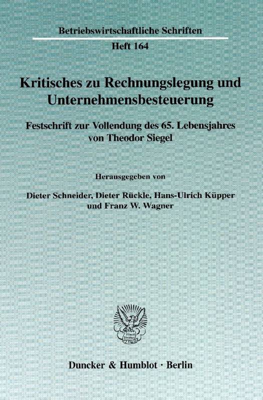 Wichtigen Arbeiten zu Grundlagenproblemen der Betriebswirtschaftlichen Steuerlehre und der Unternehmensbewertung folgten zahlreiche kritische Beiträge zur ökonomischen Analyse des Bilanz- und Steuerrechts, von denen viele die weitere Diskussion entscheidend geprägt haben. Theodor Siegel ist es dabei ein Anliegen, seine Ergebnisse mit anderen Wissenschaftlern und mit Praktikern, mit Juristen wie mit Ökonomen, zu diskutieren und in als besonders wichtig erachteten Fällen die theoretische Erörterung durch praktisches Engagement zu ergänzen, wie u. a. der von ihm initiierte Aufruf zur Rettung des Anrechnungsverfahrens und seine Arbeit als Vorsitzender der "Arbeitsgruppe Normierung der Rechnungslegung" gezeigt haben.