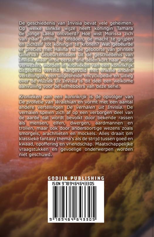 De geschiedenis van Invisia bevat vele geheimen. Op welke slinkse wijze heeft koningin Tamara de jonge Laela ontvoerd? Hoe wist Morissa zich van haar familie te ontdoen, de macht te grijpen en zichzelf tot koningin te kronen? Wat gebeurde er precies met Halina na de geboorte van prinses Ginerva? Gebeurtenissen uit de geschiedenis van Invisia, waar in de eerste drie delen kort naar wordt verwezen, worden in Kronieken van een koninkrijk uitgebreid verteld. Aangevuld met enkele andere vertellingen, een uitgebreide encyclopedie en uitleg over de Muziek uit Invisia is dit deel een welkome aanvulling voor de liefhebbers van deze serie.