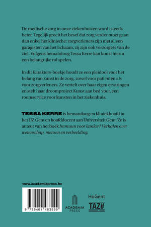 In dit Karakters-boekje houdt ze een pleidooi voor het belang van kunst in de zorg, zowel voor patiënten als voor zorgverleners. Ze vertelt over haar eigen ervaringen en stelt haar droomproject Kunst aan bed voor, een roomservice voor kunsten in het ziekenhuis.