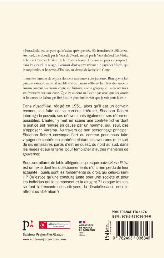 Shaaban Robert (1909-1962) est considéré comme le père de la littérature swahili moderne et ses ouvrages, qui couvrent de nombreux genres, ont forgé des générations de lecteurs et lectrices en Tanzanie. Ses textes sont devenus des « classiques » : ainsi, Wasifu wa Siti binti Saad, consacré à la célèbre chanteuse de taarab Siti binti Saad, l’autobiographie Maisha Yangu na Baada ya Miaka Hamsini, traduite en français par François Devenne [Autobiographie d’un écrivain swahili] ou encore Adili na Nduguze [Adili et ses frères,] conte fantastique et moral, lu par nombre d’écoliers. Reconnaissance méritée pour un homme qui consacra en partie sa vie au développement d’une langue swahili standardisée et à la naissance du roman moderne. Dans Kusadikika, rédigé en 1951, alors qu’il est un écrivain reconnu, au faîte de sa carrière littéraire, Shaaban Robert interroge le pouvoir, ses dérives mais également ses réformes possibles. L’auteur y met en scène une contrée fictive dont la justice est remise en cause par un homme, qui, seul, ose s’opposer : Karama. Au travers de son personnage principal, Shaaban Robert convoque l’art du conteur pour nous fait voyager de contrée en contrée, relatant les aventures et le sort de six émissaires partis d’Est en Ouest, du Nord au Sud, dans les nuées et sur la terre, pour témoigner d’autres manières de gouverner. Sous ses allures de fable allégorique, presque naïve, Kusadikika est un texte dont les questionnements n’ont rien perdu de leur actualité : quels sont les fondements du droit, qui celui-ci sert-il ? Qu’est-ce qu’une conduite juste, pour une société et pour les individus qui la composent et la dirigent ? Lorsque les lois se font à l’encontre des citoyens, la désobéissance est-elle affront ou libération ? « Un écrivain comme Shaaban n’est pas à moitié classique à moitié moderne, il est ouvert à la modernité à la mesure même de son inscription dans la dynamique de la poésie swahili orientée, depuis des siècles, vers le nouveau. » Xavier Garnier, Le roman swahili.