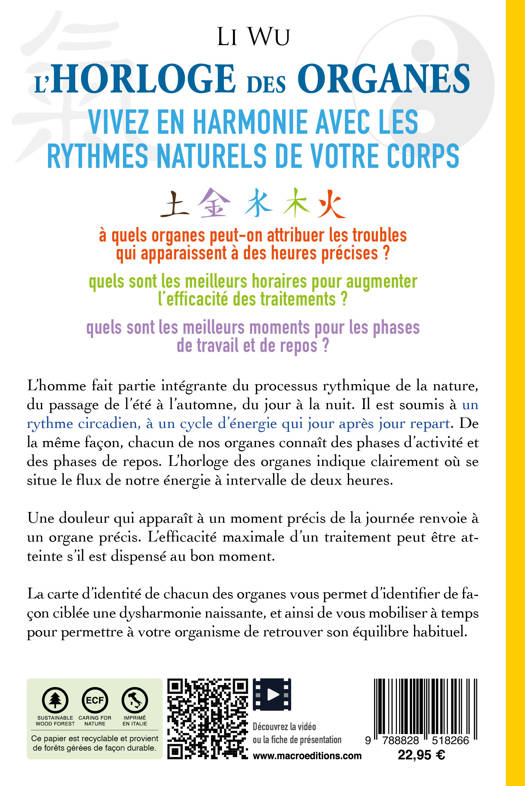 L’horloge des organes indique clairement où se situe le flux de notre énergie à intervalle de deux heures. Adaptez-vous à l’échange énergétique perpétuel qui a lieu entre le ciel et la terre, et vos énergies circuleront librement sur les plans émotionnel, spirituel et physique.