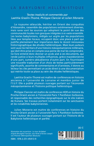 Le royaume séleucide, héritier en Orient des conquêtes d’Alexandre, rassemble des populations extrêmement diverses, mais rares sont les sources qui adoptent le point de vue des communautés locales non grecques intégrées à ce vaste ensemble. Les textes babyloniens, rédigés sur argile par les populations liées aux temples locaux, occupent donc une place à part qui justifie pleinement leur importance dans le récent renouveau historiographique des études hellénistiques. Mais leurs auteurs sont aussi les héritiers d’une histoire mésopotamienne millénaire, qui doit être prise en compte sous peine de mal les comprendre. Ce livre entend donc donner un accès aisé à ces documents, qui rende justice à leurs multiples influences, gréco-macédonienne d’une part, suméro-akkadienne d’autre part. En fournissant une nouvelle traduction d’un choix de textes particulièrement significatifs, assortie de commentaires et d’annexes, il donne au lecteur les clés permettant un accès direct à une documentation qui mérite toute sa place au sein des études hellénistiques.