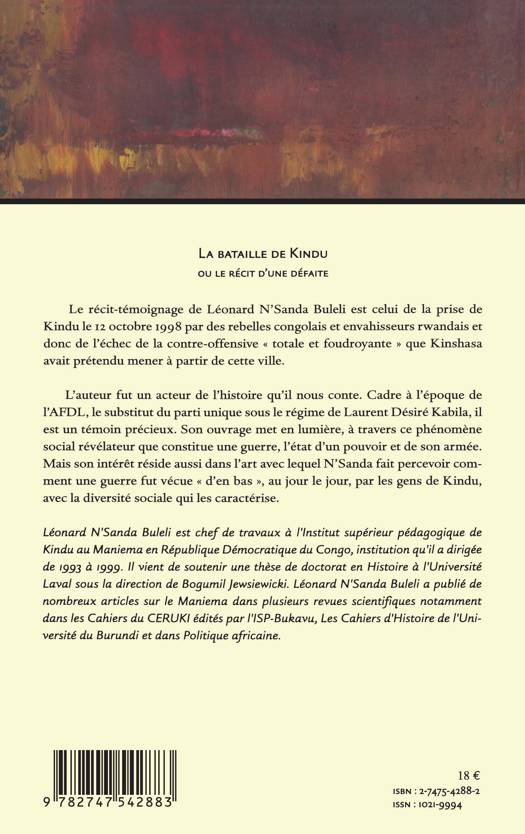 Voici le récit de la prise de Kindu le 12 octobre 1998 par des rebelles congolais et envahisseurs rwandais et donc de l'échec de la contre-offensive "totale et foudroyante" que Kinshasa avait prétendu mener à partir de cette ville. L'auteur Cadre à l'époque de l'AFDL sous le régime de Laurent Désiré Kabila met en lumière l'état d'un pouvoir et de son armée; et fait percevoir comment la guerre fut vécue d'en bas au jour le jour.