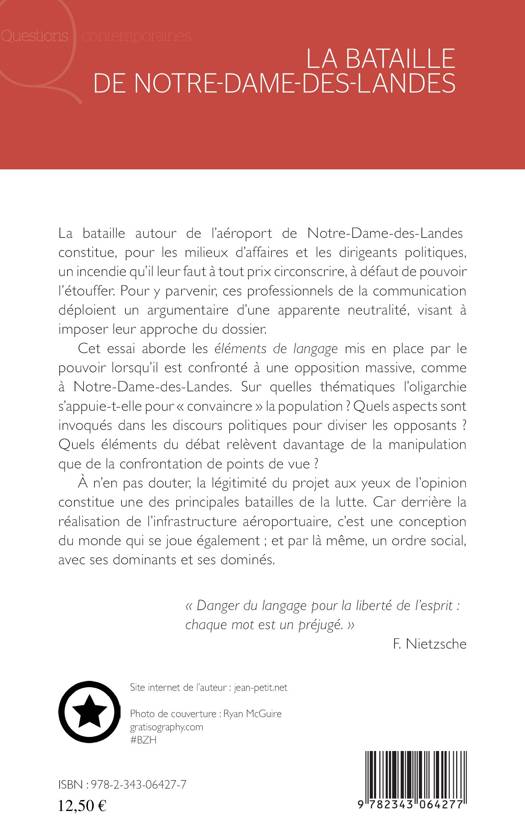 Cet essai aborde les éléments de langage mis en place par le pouvoir lorsqu'il est confronté comme c'est le cas à Notre-Dame-Des-Landes à une opposition massive. Sur quelles thématiques l'oligarchie s'appuie-t-elle pour "convaincre" la population ? Quels aspects sont invoqués dans les discours politiques pour diviser les opposants ? Quels éléments du débat relèvent davantage de la manipulation que de la confrontation de points de vue ? Derrière la réalisation de cette infrastructure, c'est une conception du monde qui se joue, un ordre social.