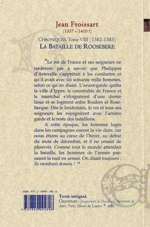 « Le roi de France et ses seigneurs ne tardèrent pas à savoir que Phelippes d'Artevelle s'apprêtait à les combattre et qu'il avait avec lui soixante mille hommes, selon ce qu'on disait. L'avant-garde quitta la ville d'Ippre, le connétable de France et le maréchal s'éloignèrent d'une demie lieue et se logèrent entre Roulers et Rosebecque. Dès le lendemain, le roi et tous ses seigneurs les rejoignirent avec l'arrière garde et le reste des bataillons.