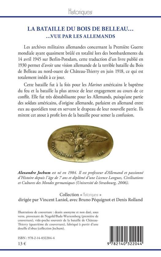 Les archives militaires allemandes concernant la Première Guerre mondiale ayant quasiment brûlé en totalité lors des bombardements du 14 avril 1945 sur Berlin-Potsdam, cette traduction d'un livre publié en 1930 permet d'avoir une vision allemande de la terrible bataille du Bois de Belleau au nord-ouest de Château-Thierry en juin 1918, ce qui est totalement inédit à ce jour. Cette bataille fut à la fois pour les Marines américains le baptême du feu et la bataille la plus atroce de leur engagement au cours de ce conflit. Elle fut très déstabilisante pour les Allemands, puisqu'une partie des soldats américains, d'origine allemande, parlaient en allemand entre eux au quotidien tout en servant le drapeau de leur nouvelle patrie. Ils mirent cet atout à profit lors de la bataille pour semer la confusion.