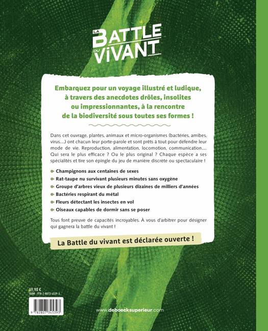 Embarquez pour un voyage illustré et ludique, à la rencontre de la biodiversité sous toutes ses formes ! Dans ce livre, plantes, animaux et micro-organismes (bactéries, amibes, virus…) ont chacun leur porte-parole et sont prêts à tout pour défendre leurs modes de vie. Reproduction, alimentation, locomotion, communication… Qui sera le plus efficace ? Ou le plus original ? Chaque espèce a ses spécialités et tire son épingle du jeu de manière discrète ou spectaculaire !