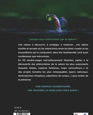 En 110 double-pages merveilleusement illustrées, partez à la découverte des phénomènes de la nature les plus surprenants (beautés fatales, espèces fantômes, loups sylviculteurs…) et des projets humains les plus remarquables (parcs nationaux, réintroduction d’espèces, pépinières de coraux…) pour tenter de la préserver.