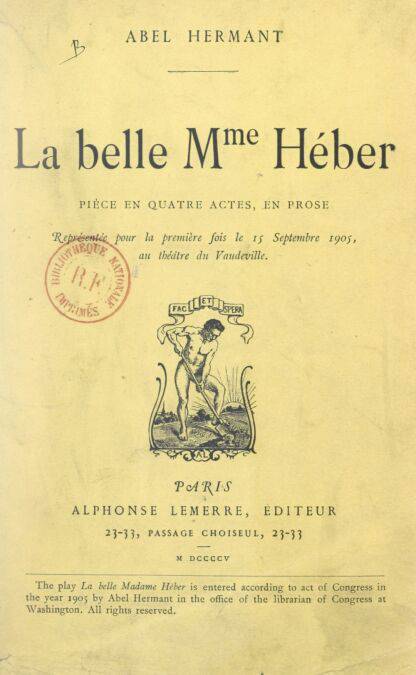 Pièce en quatre actes, en prose, représentée pour la première fois le 15 septembre 1905, au Théâtre de Vaudeville
