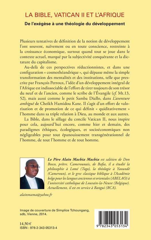 Plusieurs tentatives de définition de la notion de développement l'ont souvent restreinte à la croissance économique. L'idée d'un développement intégral de l'Afrique est indissociable de l'effort de valorisation et de promotion de ce qui définit l'homme dans sa triple relation à Dieu, au monde et aux autres. La Bible inspire des paradigmes éthiques, écologiques et socioéconomiques non négligeables pour tout épanouissement transgénérationnel de l'homme.