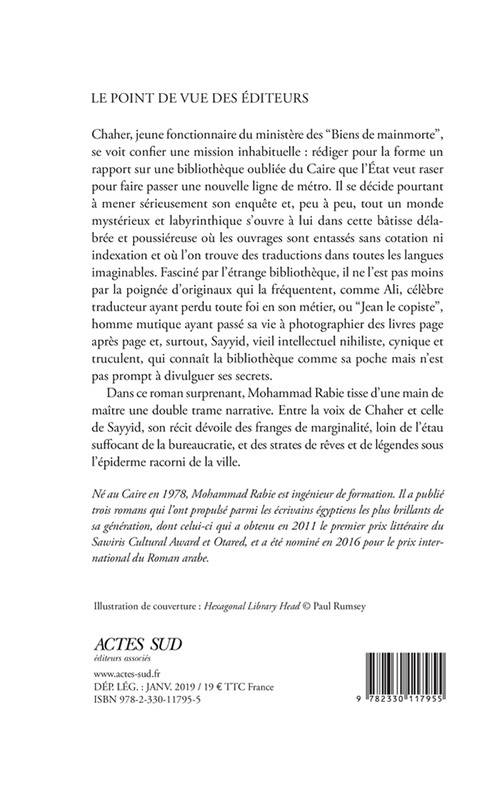 Chaher, jeune fonctionnaire du ministère des "Biens de mainmorte", se voit confier une mission inhabituelle : rédiger pour la forme un rapport sur une bibliothèque oubliée du Caire que l'État veut raser pour faire passer une nouvelle ligne de métro. Il se décide pourtant à mener sérieusement son enquête et, peu à peu, tout un monde mystérieux et labyrinthique s'ouvre à lui dans cette bâtisse délabrée et poussiéreuse où les ouvrages sont entassés sans cotation ni indexation et où l'on trouve des traductions dans toutes les langues imaginables. Fasciné par l'étrange bibliothèque, il ne l'est pas moins par la poignée d'originaux qui la fréquentent, comme Ali, célèbre traducteur ayant perdu toute foi en son métier, ou "Jean le copiste", homme mutique ayant passé sa vie à photographier des livres page après page et, surtout, Sayyid, vieil intellectuel nihiliste, cynique et truculent, qui connaît la bibliothèque comme sa poche mais n'est pas prompt à divulguer ses secrets.
