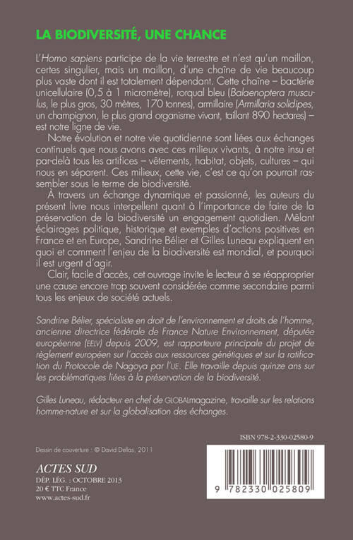 À travers un échange dynamique et passionné, les auteurs du présent livre nous interpellent quant à l'importance de faire de la préservation de la biodiversité un engagement quotidien. Mêlant éclairages politique, historique et exemples d'actions positives en France et en Europe, Sandrine Bélier et Gilles Luneau expliquent en quoi et comment l'enjeu de la biodiversité est mondial, et pourquoi il est urgent d'agir.