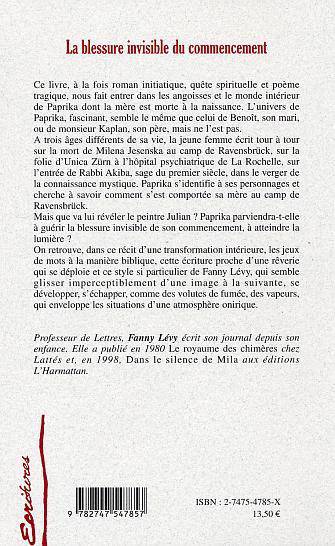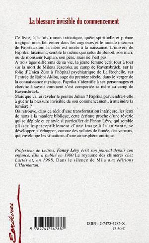 Ce livre, à la fois roman initiatique, quête spirituelle et poème tragique, nous fait entrer dans les angoisses et le monde intérieur de Paprika dont la mère est morte à la naissance. A trois âges différents de sa vie, la jeune femme écrit tour à tour sur la mort de Milena Jesenka au camp de Ravensbrück, sur la folie d'Unica Zürn à l'hôpital psychiatrique de La Rochelle, sur l'entrée de Rabbi Akiba, sage du premier siècle, dans le verger de la connaissance mystique. Elle s'identifie à ses personnages et cherche à savoir comment s'est comportée sa mère au camp de Ravensbrück. Paprika parviendra-t-elle à guérir la blessure invisible de son comportement, à atteindre la lumière ?